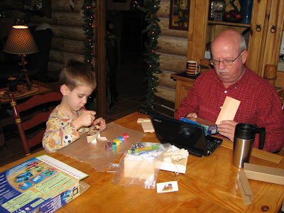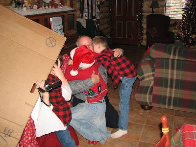 I think it was about noon on Thursday when Mom & Dad showed up and crawled into the box for the kids to unwrap. :-) After all that excitement I really don't know what we did with the rest of the day. I know what we were supposed to do, but didn't. It's been a tradition of ours to bake gingerbread men and decorate them on Christmas Eve, but I thought for a change we'd make a gingerbread house this year instead. It was a good plan... Ha! I made the gingerbread, we cut it out, my artistic mother etched the most crooked bricks I've ever seen in my life on it (who would've known?!), we baked it up... and all of the pieces are STILL sitting in a bag in the kitchen! We never did get it put together!!! My new goal is to construct it sometime before New Years Day. We'll see.